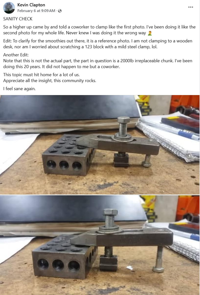 “Top one can have the possibility of pushing the part and very low holding power as well as deformation of the edge of the part. Your heel should always be higher than surface clamping to make sure you only have downward pressure on the block directly underneath the clamp. Makes you wonder how some people make it to higher up positions”