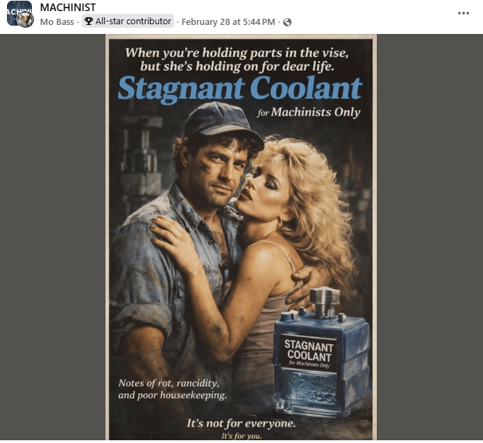 This week’s edition starts with what might be the most accurate machinist cologne ever created — Stagnant Coolant. Notes of rot, rancidity, and a coolant sump that definitely hasn’t been cleaned in a while.